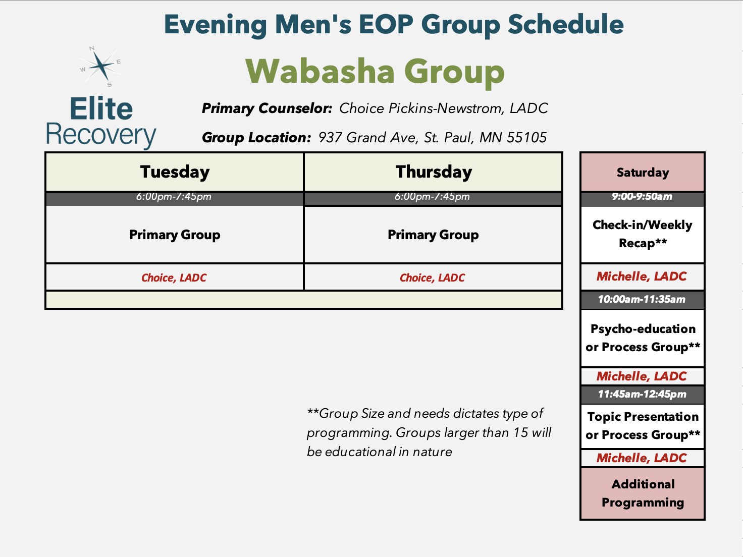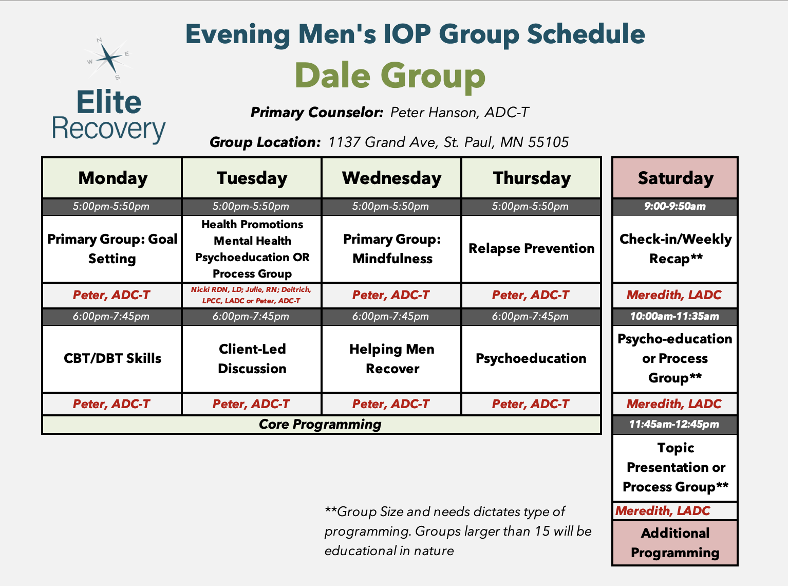 Each group session focuses on skill development, relapse prevention, emotional regulation, and peer support.